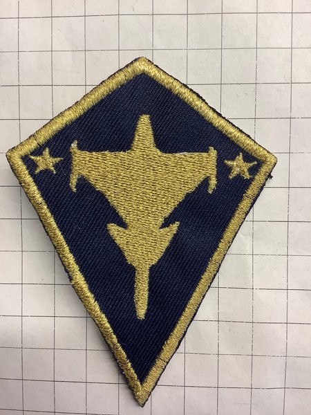 Detta är ett broderat märke i form av en romb. Märket har en mörkblå bakgrund med en stiliserad guldfärgad flygplanssymbol i mitten och två stjärnor på sidorna. Runt kanten finns en guldfärgad broderad kant. Obs replika.