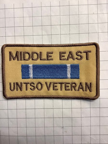 Ett broderat märke med texten "MIDDLE EAST UNTSO VETERAN" och ett blått band med två vita ränder.