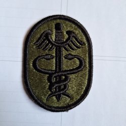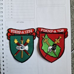 Broderad tygmärke med Rikshemvärnsstaben emblem. Märket har en grön bakgrund med en stiliserad krona och tre mindre kronor ovanför bokstaven H. Texten "RIKSHEMVÄRNSSTABEN" är broderad runt kanten.