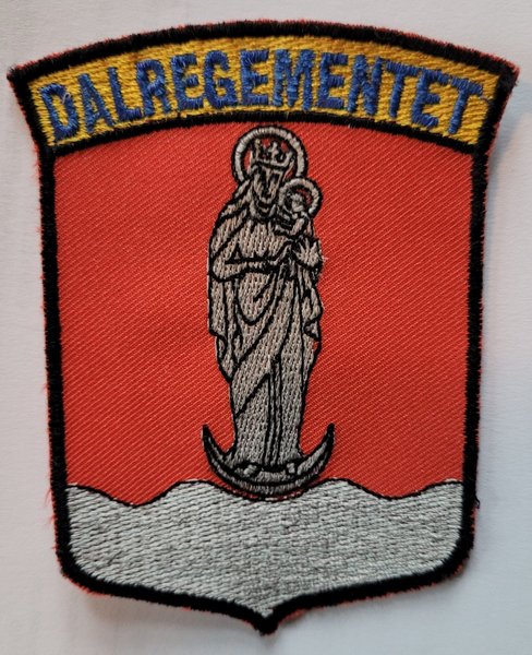 Broderad tygmärke med motiv av Jungfru Maria med barnet Jesus. Märket har texten "DALREGEMENTET" broderat i blått på en gul bakgrund. Bottenfärgen är röd och nederdelen är grå.