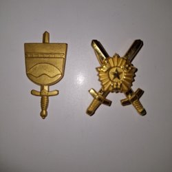 Rund tygmärke med guldkant. Märket har en krona, ett grått fält med tre röda eldslågor och två korslagda gevär. Texten "FO 48 HEMVÄRNET" finns broderat nedtill.