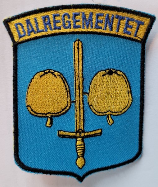 Broderad tygmärke med Dalregementets vapen. Märket har en ljusblå bakgrund med en guldfärgad bård upptill där "DALREGEMENTET" är skrivet i blått. I mitten syns ett svärd med två runda föremål på vardera sidan.