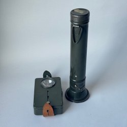 Tre vintage ficklampor. Två ficklampor från tiden under andra världskriget. Diamon Contact, en utan etikett och en Honour Tricolor.