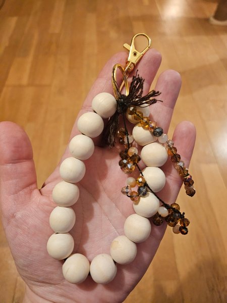 Hemmagjord nyckelring med en kraftig ring klädd med naturliga träpärlor. En rand med blommor och en rak rand pärlor. Båda gjorda av glaspärlor och vaxat starkt snöre.