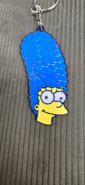 Nyckelring med Marge Simpson från The Simpsons. Marge har sitt karaktäristiska blåa hår och gula ansikte. Nyckelringen är tillverkad av metall och emalj.
