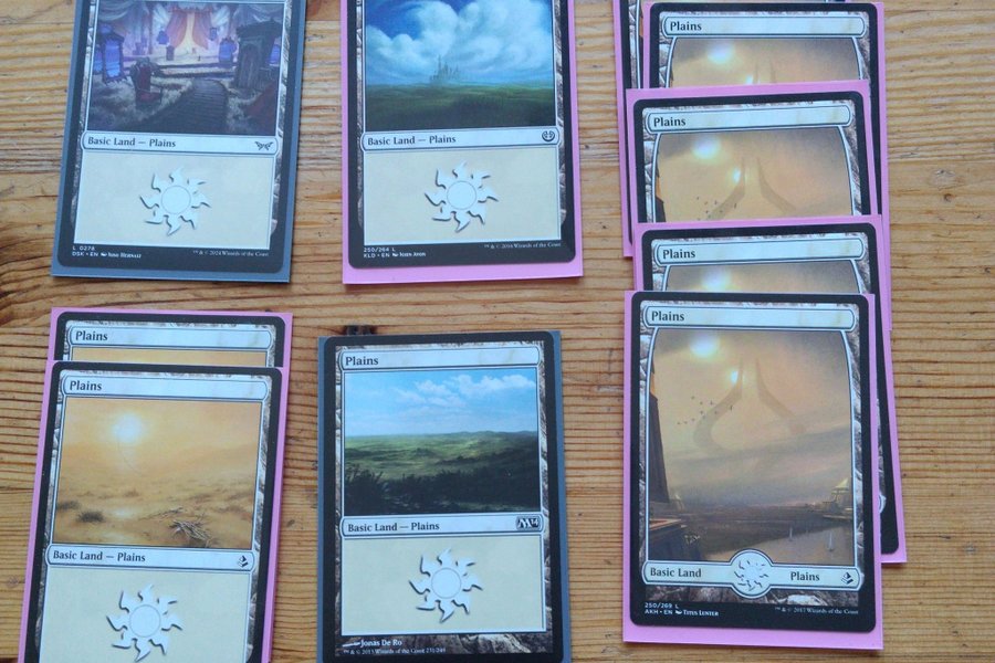 Dessa Magic the Gathering Plains Basic Land-kort är en blandning av olika utgåvor, inklusive DSK, KLD, AKH och M14. Korten är av typen Basic Land – Plains.