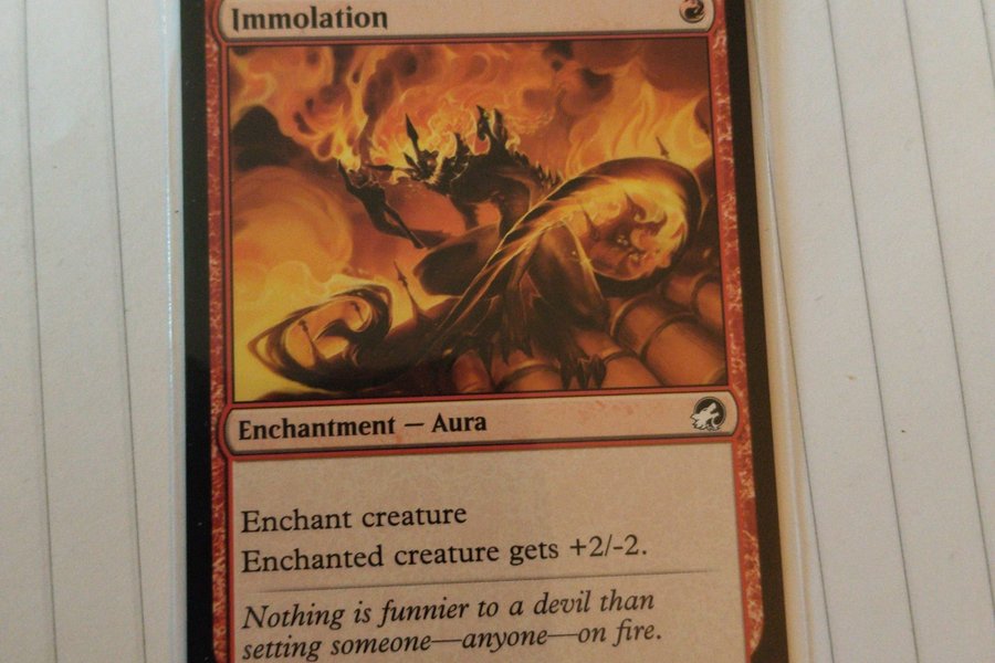 Kortet Immolation från Magic the Gathering. Kortet är av typen Enchantment — Aura. Det har texten "Enchant creature. Enchanted creature gets +2/-2. Nothing is funnier to a devil than setting someone—anyone—on fire." Kortet är nummer 144/277 C från upplagan MID EN och är illustrerat av Olena Richards.