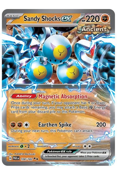 Sandy Shocks ex fra Scarlet & Violet: Paradox Rift er et elektrisk Pokémon-kort med imponerende 220 HP. Som ultra rare-kort bringer det både styrke og enestående design til din samling. Perfekt til spillere og samlere, der søger noget unikt.