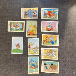 Samlarbilder med motiv av Hans och Greta, Rödluvan, Stålmannen, Tarzan, Fantomen och Flipper.