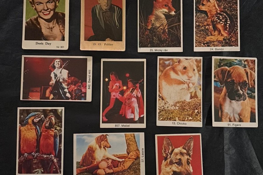 Diverse samlarbilder med motiv som Doris Day, Fabian, Micky räv, Bambi, David Hill, Mabel, Chicko, Figaro, Hado o Hodo, Lassie och Roy.