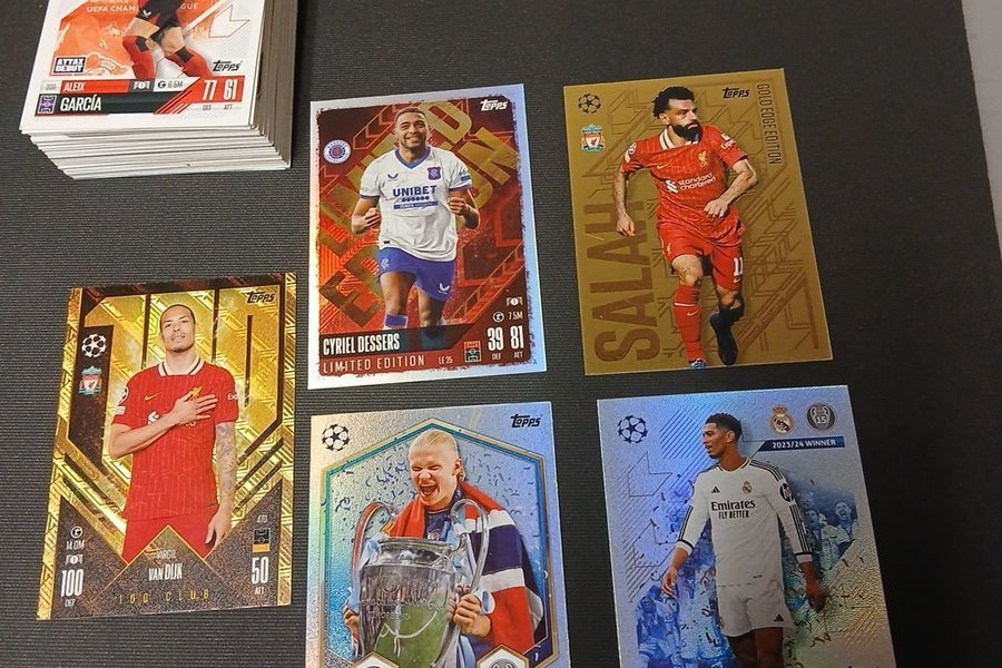 Fotbollskort från Topps. Inkluderar spelare som Garcia, Cyriel Dessers, Salah, Virgil Van Dijk, Erling Haaland och Jude Bellingham.