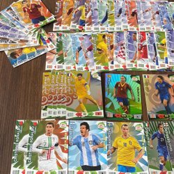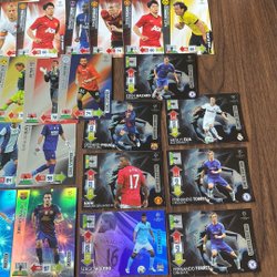 Samling av fotbollskort med kända spelare som Zlatan Ibrahimovic, Kaká, Cristiano Ronaldo, Lionel Messi, Antoine Griezmann, Roy Keane och Thibaut Courtois. Perfekt för samlare!