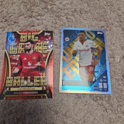 Säljer tre fotbollskort. Korten inkluderar en "Trophy Triumph"-kort, ett "Limited Edition"-kort med Matt O'Riley och ett "Top-Class"-kort med John Stones.
