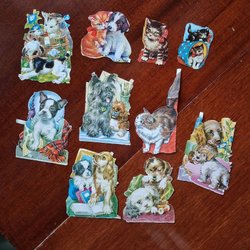 Dessa kattbokmärken föreställer katter i olika situationer. En bild visar katter i ett sovrum, en annan visar en kattunge i en korg, och ytterligare en visar katter i en bil. Bilderna är utskurna i olika former.