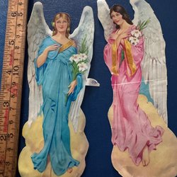 Två ängla bokmärken med blomstergirlanger. Bilderna är i färg med glitterdetaljer. Baksidan är vit. Linjalen visar storleken.