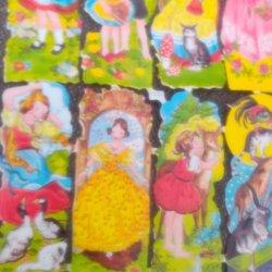 3 st. äldre pappbilder med motiv av tupp och höna, Snövit och de sju dvärgarna, samt flicka med duvor. Bilderna är tryckta på papp och har rundade hörn.