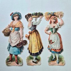 Antikt viktorianskt märke. Bilden visar en grupp barn som dansar i en ring, med en vuxen person i mitten. Bilden är utskuren och har präglade detaljer.