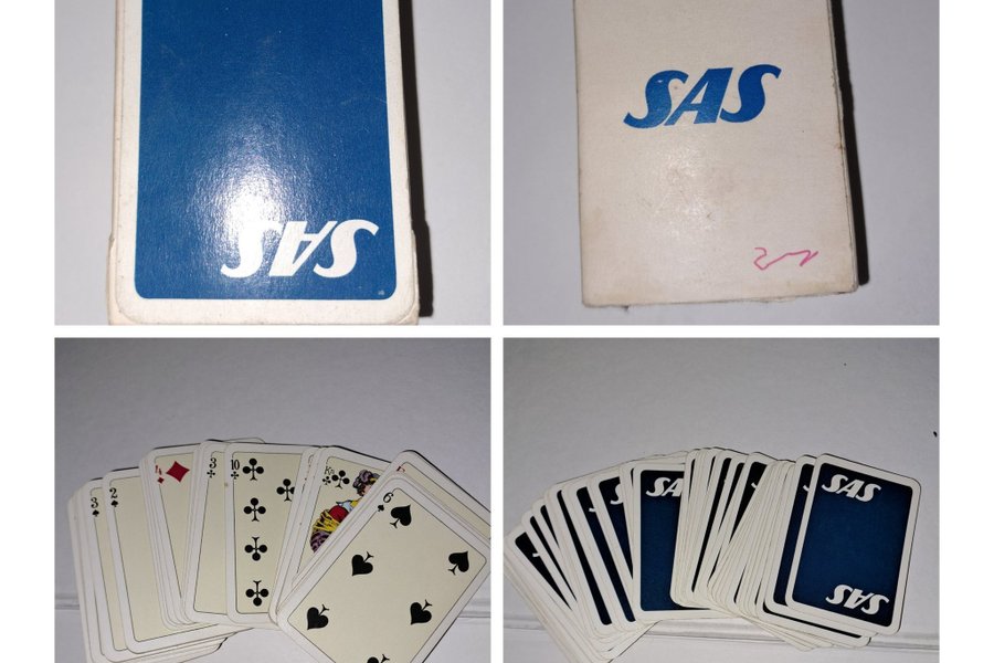 Spelkort med SAS-logotyp. Orginal föroackning medr en blå sida med vit SAS-text och en vit sida med blå SAS text. Spelkorten har blp baksida med vit SAS text. Komplett med 52 spelkort. Höjd ca 7 cm