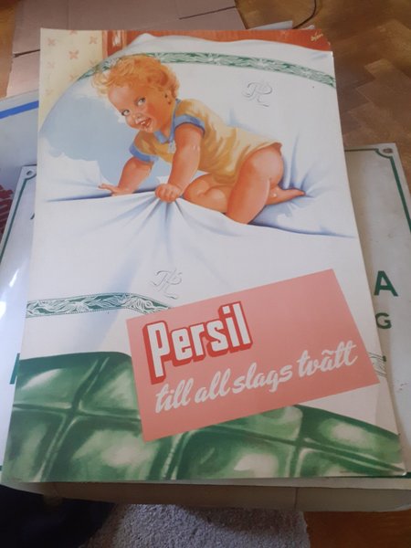 En pappskylt med motiv av en bebis och texten "Persil till all slags tvätt". Mått 35cmx50cm. En liten skada längst upp till höger.