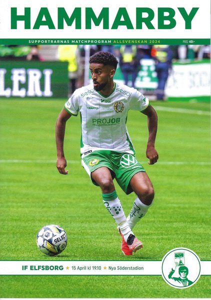 Matchprogram för Hammarby Fotboll, Allsvenskan 2024. Innehåller information om laget, spelare och match mot IF Elfsborg den 15 april kl 19.10 på Nya Söderstadion.