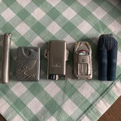 2 st tändare med coola motiv ena fungerar fortfarande för där är stift kvar den andra fattas stift lätt o byta tror till och med det är en Zippo övermålad eller lackad kan vara en liten skatt för en samlare båda fungerar annars likaså dom andra tändarna i övriga auktioner funkar med stift