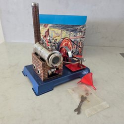 Ångmaskin med skorsten och svänghjul. Denna modell har en röd spak och en röd bricka.