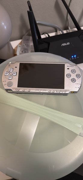 Sony PSP 2004 i silverfärg. Konsolen har knappar för hem, volymkontroll, start och select. Den har även en strömknapp och en hållfunktion.
