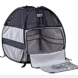 Hopfällbar hundbur med tassmönster. Perfekt för resor eller som en säker plats hemma. Buren har nätfönster för ventilation och en öppning med dragkedja.