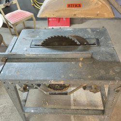 Bordssåg med stativ. Sågen har en skyddskåpa över klingan och en sidoförlängning på bordet.