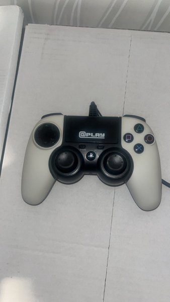 Handkontroll från Q Play. Denna handkontroll är designad för att vara kompatibel med PlayStation-konsoler. Den har en vit och svart färgkombination med de klassiska PlayStation-knapparna (triangel, cirkel, kryss, kvadrat) samt SHARE- och OPTIONS-knappar. Kontrollen är trådbunden.