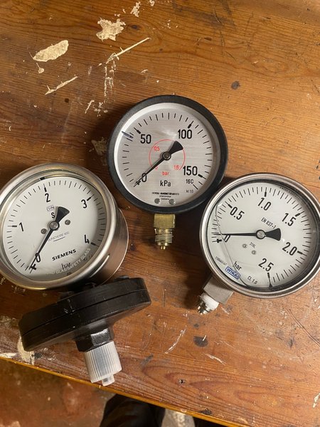 Tre manometrar av olika fabrikat. En Siemens Duratherm 600, en Svenska Manometerfabriken och en WIKA. 1,6 bar 2,5 bar 4 bar