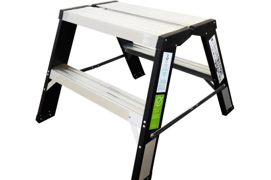 Robust arbetsbock i aluminium med två steg, arbetsyta på 666x698 mm, plattformsmått på 600x300 mm och 80 mm djupa steg. 2-stegsbocken är godkänd enligt Bra Arbetsmiljöval, nivå 1.