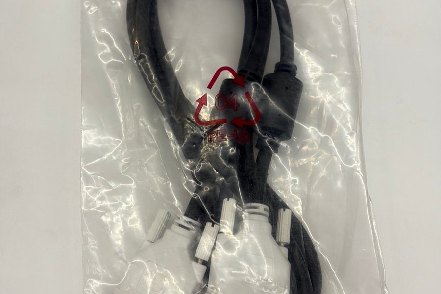 DVI-kabel för anslutning av bildskärm eller annan kompatibel enhet. Kabeln är svart med vita kontakter.