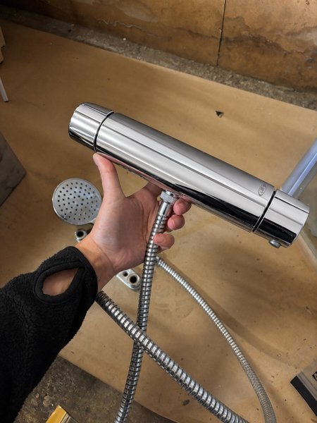 Duschblandare från Oras. Ser ut som Oras Nova. Medföljer en duschslang med handdusch som skulle behöva avkalkas. Väggfästena är ej rengjorda, blandaren är avtorkad.