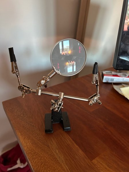 Tredje hand med förstoringsglas för precisionsarbete. Den har justerbara armar med klämmor och en stabil bas.