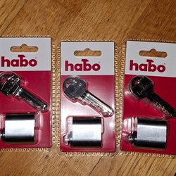 Habo låscylindrar i 3-pack, kromutförande. Perfekt för att säkra dörrar och andra tillhörigheter. Skruvar med knoppar 40 medföljer. Se bilder för mer information. 5 nycklar. Ny pris på bolist 1190 kr