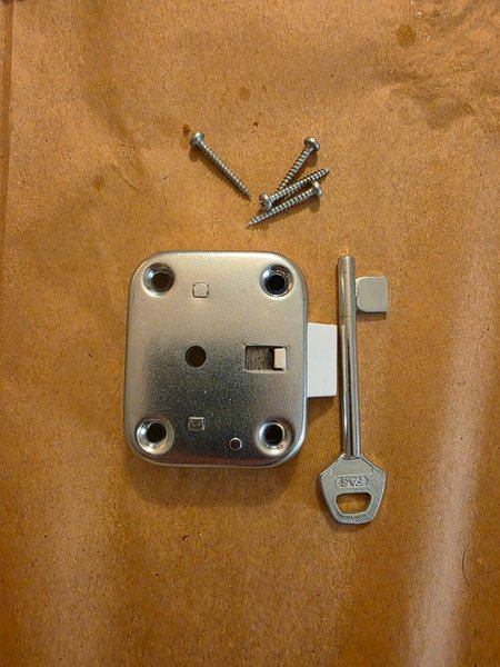 Låskista med tillhörande nyckel och skruvar. Perfekt för dörrar eller andra applikationer som kräver ett lås.mått 6x5x1,5cm