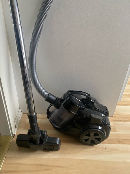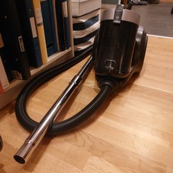Dammsugare i svart färg. Modellen är en cylinderdammsugare med slang och munstycke. Den har hjul för enkel förflyttning. Pås lös