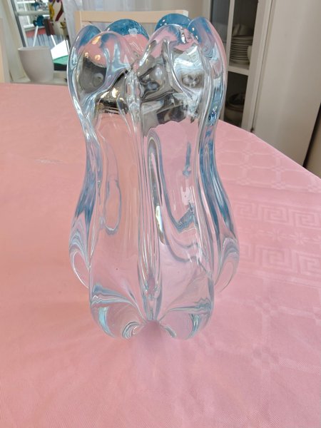 Säljer en klassisk "Stella Polaris" vas, formgiven av Vicke Lindstrand för Orrefors år 1936. Vasen är ett fantastiskt exempel på svensk glaskonst med sin tunga, organiska form som påminner om en isformation. Den mjuka blå tonen ger ett magiskt ljusspel när den placeras i ett fönster.
