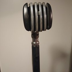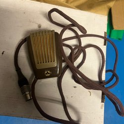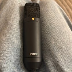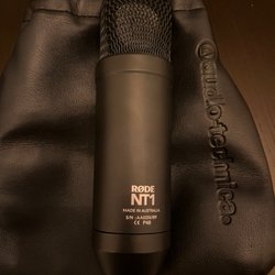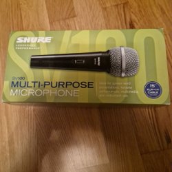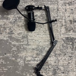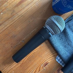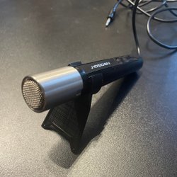 Säljer en mikrofon. Den har en strömbrytare och en XLR-kontakt.