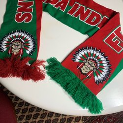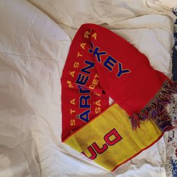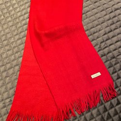 En röd halsduk med fransar.