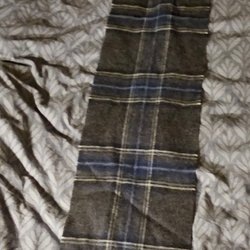 Vit halsduk med ett svart rutmönster och fransar i ändarna. Mäter cirka 130*26 cm (minus fransarna)