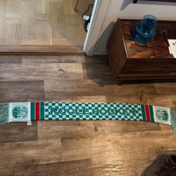 Grön halsduk med gula detaljer. Halsduken har texten "Threfelder Zigeunner von 1965 e.V." i gult. I ena änden finns en cirkulär logotyp med texten "Threfelder Zigeunner von 1965" runt en bild av en vagn dragen av en häst. I andra änden finns en detaljerad bild av en örn med två huvuden och en krona. Båda ändarna har fransar i gult och grönt.