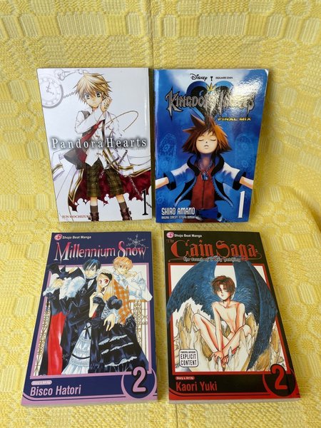 Ett paket med fyra manga-böcker: Pandora Hearts Vol. 1 av Jun Mochizuki, Kingdom Hearts Final Mix Vol. 1 av Shiro Amano, Millennium Snow Vol. 2 av Bisco Hatori och Cain Saga Vol. 2 av Kaori Yuki.
