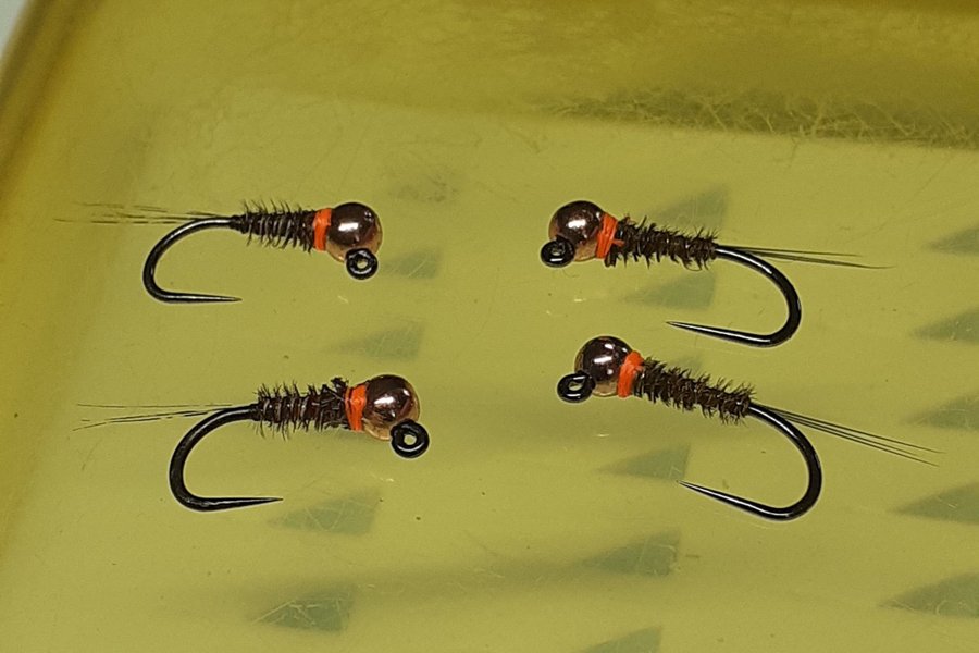Pheasant tail-nymfer med copper (2,5 mm slotted tungsten), naturell fasan, copper wire och svart micro fibetts. Fluo orange hotspot. Bunden på Hends jigkrok 120 stl 16 och 18.