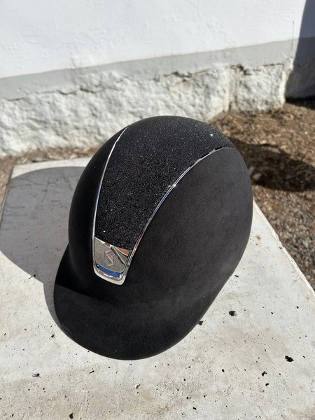 Samshield ridhjälm i svart med glitterpanel. Hjälmen har en mocka yta och en glittrig mittpanel, samt silverdetaljer. I nyskick då den endast är använd ett 10 tal gånger. Storlek M58.