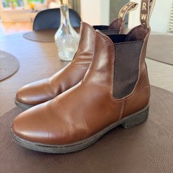 Ett par bruna Chelsea boots med resår i sidorna för enkel på- och avtagning. Skorna har en klassisk design och en robust sula.