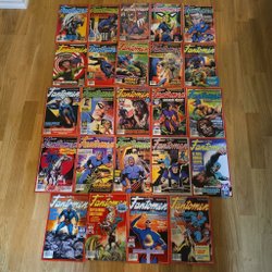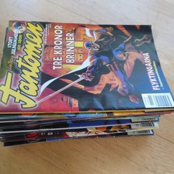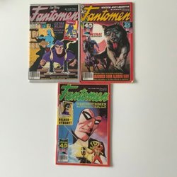Fyra Fantomen tidningar. En av tidningarna är från 1994 och har 84 sidor. En annan tidning har texten "VAL I BENGALI Del 2 - FÖRLORAREN" på framsidan.