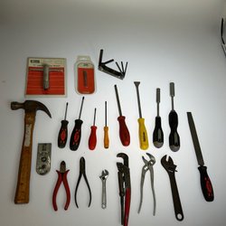 Inkluderar hammare, färgskrapa, fil, stålborste och vattenpass. Se bilder för egen bedömning.