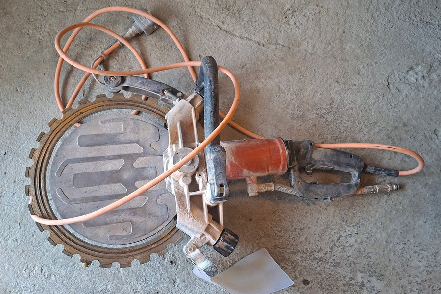 Väggsåg med orange kabel och ett stort sågblad. Maskinen har ett rött motorhus och svarta handtag. En vattenanslutning finns nära handtaget.